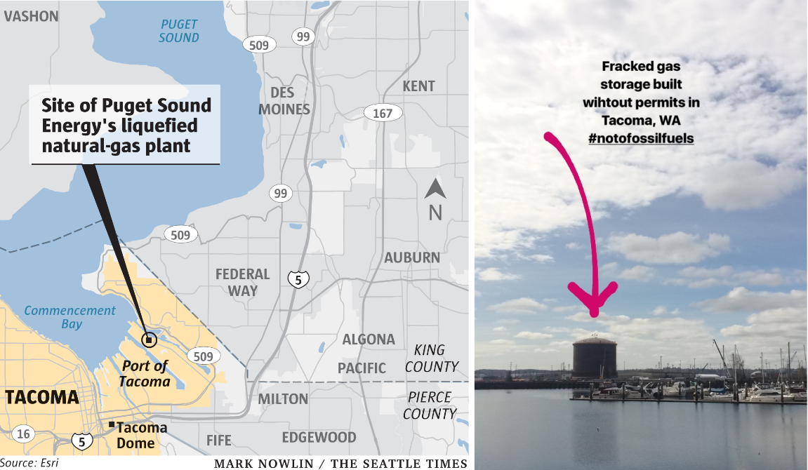 Left: All sites in this NE Tacoma Neighborhood sign are within the 2-mile blast zone of the LNG plant Right: Many local residents oppose the LNG development, some displaying #NOLNG signs